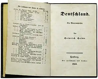 1. ^ a b Amey, L. J. (1997-01-01). Censorship: Gabler, Mel, and Norma Gabler-President's Commission on Obscenity and Pornography. Salem Press. p. 350. ISBN 9780893564469. Ironically, Heine became famous because of censorship, particularly after he wrote a political cycle of poems entitled Germany. A Winter's Tale in 1 844 that was immediately banned throughout the confederation