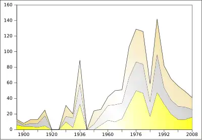 Medals won by Germany at the Summer Olympic Games between 1896 and 2012 (between 1956 and 1964 as the United Team of Germany and between 1968 and 1988 as a sum of medals of West and East Germany)