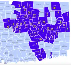 Approximate distribution of gravestones carved by Bartlett in Eastern and Central Connecticut.