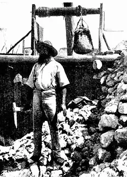 An ethnic-Chinese market gardener, 'Charley' Chin set up a market garden, on the common land just outside the village and supplied the village with fresh fruit and vegetables, an incredible feat in a semi-arid area. He painstakingly dug an in-ground 'tank' to store precious water for the garden, using only hand implements and a wooden wheelbarrow.[32][33][34] If he had a surplus of produce, he was known to carry it by bicycle to Mount Hope, returning in time to water his crops at least weekly.[35]