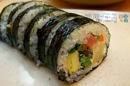 Along with miyeok and sweet kelp, gim is one of the most widely cultivated and consumed types of seaweed in Korea.[3] The dried sheets of gim are often rolled to wrap and be eaten with rice. Gimbap is a dish in which gim is not only rolled with rice, but also meat, fish, or vegetables. Gim also can be eaten without rice by roasting with sesame oil or frying and cutting it to make side dishes (banchan) such as bugak.[3][4]