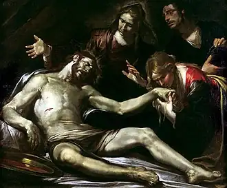 In 1640, Assereto painted The Lamentation,[4] a powerful picture which uses a black background and intense shadows to give dramatic effect to Christ's dead body that almost seems to shimmer in the darkness.[5] A work also showing this Caravaggist influence is the Death of Cato (Musei di Strada Nuova, Palazzo Bianco, Genoa), in which Assereto moved away from his refined style with vivid colours to a bolder, more powerful style where theatrical effects of flaming torches and candlelight emphasize violent emotions. The work also shows the influence of northern Caravaggesque painters such as Gerrit van Honthorst and Matthias Stom.[1]