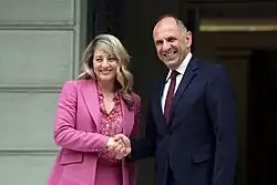 On 17 May 2024, Gerapetritis met with the Canadian Minister of Foreign Affairs, Mélanie Joly, in Athens.[32] After their meeting, Gerapetritis said in their statements that the two countries are linked by "common understanding and shared principles based on the defence of democracy, the rule of law and humanitarianism" and that "Greece and Canada have stood from the outset together against revisionism."[32]