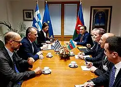 On 11 and 12 July 2023, Gerapetritis attended the NATO summit in Vilnius, along with Prime Minister Mitsotakis.[59] On the sidelines of the summit, he met with Macedonian Foreign Minister Bujar Osmani for the first time, and they discussed bilateral relations and stronger sectoral cooperation, as well as cooperation in the gas and energy connection between the two countries.[60] Gerapetritis also met with the Georgian Foreign Minister Ilia Darchiashvili and they discussed the cooperation between the two countries and the security environment created in the region, as well as the role of Georgia as a partner of NATO.[61] Gerapetritis also met with his Estonian counterpart, Margus Tsahkna, and they discussed the ways to strengthen the bilateral cooperation between the two countries and the cooperation between them within the EU, as well as discussing the Organization for Security and Co-operation in Europe (OSCE).