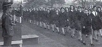 The first Girls Training Corps units were formed in 1941.[8] The GTC's purpose, as with other cadet organisations at the time, was to prepare young people for service to their community and to support in the war effort upon reaching adulthood.[7][9] For the Girls Training Corps this meant training in military drill[10] in preparation for potentially serving in the Auxiliary Territorial Service.[11][12] The GTC was open to girls aged 14 to 20, and its motto was "To serve and Train for Service".[13]
