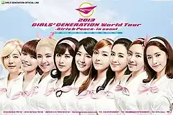 Girls & Peace World Tour is the third concert tour by South Korean girl group Girls' Generation. The tour was officially announced in April 2013 after the last 2 days of "2nd Japan Tour" with two dates in South Korea and plans for future dates across the globe.[1] Although initially announced as a "world" tour, the group only visited seven cities in six countries across East Asia and Southeast Asia. They released a DVD of Seoul concert, 'Girls' Generation - World Tour: Girls & Peace in Seoul' on March 30, 2015.
