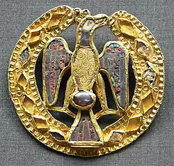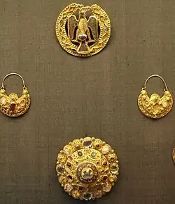 In 1880, a treasure of golden jewellery of 25 pieces was discovered by building workers. In 1913, Otto von Falke published this discovery and attributed it to Gisela. Since then, it has often been called "Gisela's jewels" or "Gisela's treasure". According to the Frankfurter Rundschau, the treasure is considered "the most important testimony of medieval gold jewellery". There are a lot of debates about the dates, the true origin place of the treasure and the owner though. It is generally agreed that the pieces come from different eras. In a 2017 exhibition Hessisches Landesmuseum Darmstadt, it was argued that the jewels were found in a field near Wiesbaden, with some pieces being nineteenth-century forgeries created to persuade Emperor Wilhelm II to buy them for an excessive price. Mechthild Schulze-Dörrlamm refutes these theories, claiming that the treasure is genuine and the place where they were found is Mainz, but opines that the treasure, with most of the pieces created in the eleventh century, should be associated with Agnes of Poitou, Gisela's daughter-in-law. Charles T. Little from the Metropolitan Museum of Art, relying on the date identified as late tenth century by Hiltrud Westermann-Angerhausen and Hermann Fillitz as well as Byzantine influence, linked the treasure to Theophanu.[45][46][47][48] Peter Lasko suggests a date of Late Carolingian. The most notable piece was the fibula with the eagle (or peacock) shape. Its authenticity has never been doubted, but the latest investigations have also failed to establish a clear date. Birgit Heide opines that the date was either much earlier than the assumed date of the second half of the ninth century (thus Late Carolingian), or between 975 and 1025.[49][50]