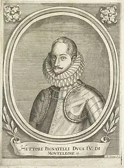 • Fabrizio Pignatelli, 3rd Prince of Noia (1604–1664), who married Girolama Pignatelli, Duchess of Monteleone, a daughter of Héctor Pignatelli y Colonna, 4th Duke of Monteleone, and Caterina Caracciolo y Mendoza (a daughter of Carlo Caracciolo, 6th Count of Sant'Angelo).[7]