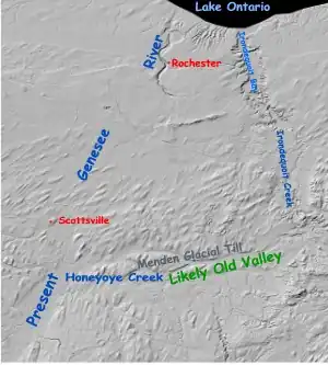 In the lower part of the river, before entering Lake Ontario, the river appears to have been diverted once again from its ancient valley by the glacier. The original valley is thought to be that of Irondequoit Creek and Bay. The second image shows the most likely (buried) westward path originally followed by the river. With this blocked, the river cut a new channel, and created three waterfalls where it crossed limestone escarpments.