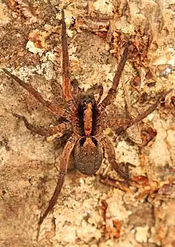This spider is nocturnal and hides during the day.[4] It makes no web or shelter of any kind and hides under leaves in the day.[4] The female carries its eggs in a spherical sac until they hatch, after which the spiderlings may ride on the female until able to fend for themselves.[4]