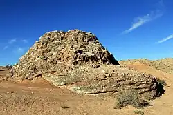The Glass Mountain is a geologic feature in Lower Cathedral Valley of Capitol Reef National Park consisting of large selenite (gypsum) crystals forming a mound or plug 15 feet high. Gypsum was deposited as sea water evaporated 165 million years ago and then buried under other sediments. The gypsum migrated upwards through fractures in the sediments forming layers and, very rarely, domes like the Glass Mountain. There is only one exposed selenite plug within the park and one other just outside which has been reduced to ground level by collectors.