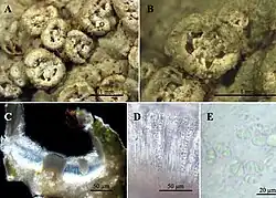 | Morphology and anatomy of Glaucotrema thailandicum A–B habit of ascoma, C cross-section of ascoma showing whitish and reticulate columella, D asci with spores, and E submuriform ascospores (holotype). | |