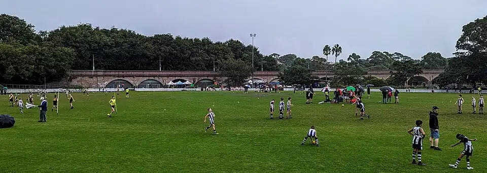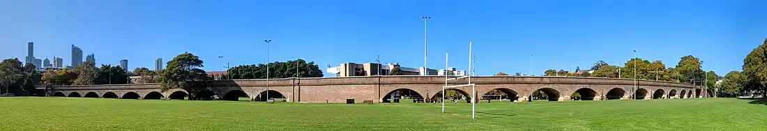 Jubilee Park viaduct is a 28-span brick arch viaduct built on a curve extending from the east of Jubilee Park at Victoria Road to The Crescent, Annandale. The viaduct contains more than two million bricks from the former State Brickworks at Homebush Bay. The bricks are laid in English bond pattern with soldier courses defining the archways. The arches are evenly spaced, being 28 x 10.06-metre (33.0 ft) clear spans. The viaduct stretches approximately 446.5 metres (1,465 ft), making it the largest brick viaduct in the NSW rail system.[1]