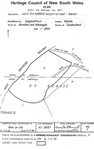 In 1982 the house and part of its estate (bounded by the Main Southern Railway on the west) was made subject of a Permanent Conservation Order under the NSW Heritage Act 1977. Meanwhile, the larger estate was designated a Scenic Protection zone in 1975 and part of it set aside for development of a botanic garden in 1984.[1]