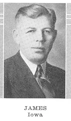 James was born on April 19, 1890, in Montfort, Wisconsin.[1] James was a farmer. He served on the Montfort town board and was chairman. James also served on the school board as a clerk.[2][3] He graduated from high school in 1906. James died of a stroke on February 1, 1962, in a Dodgeville, Wisconsin, hospital.[1][4]