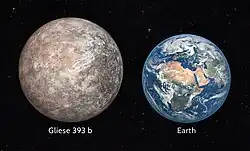 Artist's impression and size comparison of the planet Gliese 393 b with Earth, assuming Earth-like composition