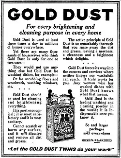 By 1892, the product's advertising and attention-grabbing packaging—black and white graphics on a bright orange background—became more focused on the iconic Gold Dust Twins.[8][3] The Gold Dust Twin characters of Goldie and Dustie were the faces of Gold Dust products through most of their production, becoming one of the earliest brand-driven trademarks in American advertising.[3] They were often comically depicted, along with a huge stack of dishes in a washtub, with one twin cleaning, the other drying.[8] The Gold Dust Twins Radio Show—first broadcast in 1929 and created around the twins (and sponsored jointly by Gold Dust and Lever Brothers)—was one of the first of its kind in marketing history. The back of the box depicted the twins tackling several household chores and a list of jobs made easier by using Gold Dust washing powder.[4] "Let the Twins Do Your Work" was the product's slogan.[4]