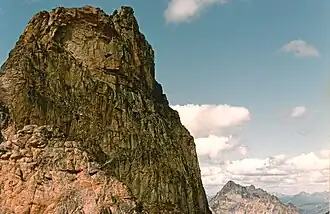 Golden Horn is an 8,366-foot (2,550-metre) mountain summit located in Okanogan County in Washington, United States. It is part of the Okanogan Range which is a sub-range of the North Cascades Range.[1] Golden Horn is situated north of Methow Pass at headwaters of the Methow River, on land administered by the Okanogan–Wenatchee National Forest. It ranks as the 101st-highest summit in Washington.[2] The nearest higher neighbor is Tower Mountain, 1.67 miles (2.69 km) to the southeast.[1] Topographic relief is significant as the summit rises approximately 3,366 feet (1,026 meters) above the West Fork Methow River in one mile (1.6 km). The first ascent of Golden Horn was made by Fred Beckey, Keith Rankin, and Charles Welsh on September 18, 1946.[4]