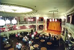 The first show to open on the stage was Slue Foot Sue's Golden Horseshoe Revue (mistakenly spelled "Review") on July 17, 1955. The revue's music was written by Charles LaVere, who served as the show's pianist, and used lyrics by Tom Adair. The script for the production was co-authored by two of its stars, Donald Novis and Wally Boag. This variety show ran a record 39,000 times and is listed in the Guinness Book of Records as the longest-running musical of all time. One of the features of the show was to have children from the audience sing and dance on stage. "Davy Crockett" was a favorite song performed by the guests.[1]