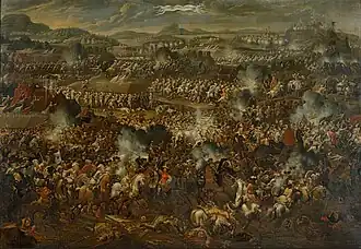 The second painting depicts The relief of the city of Esztergom (At Dorotheum Vienna auction of 4 October 2000, lot 177). The painting which is signed and dated 1686 depicts the battle against Turkish forces for the relief of Esztergom (called 'Gran' in German), now in Hungary, which took place in August 1685. The Christian troops were under the command of Charles V, Duke of Lorraine and the elector Maximilian II Emanuel, Elector of Bavaria. This picture like the first one offers a bird's eye view on several planes of the intense fighting between the Christian and Turkish forces.[6]