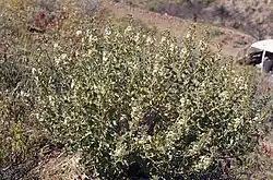 Goodenia chambersii is an ascending shrub that typically grows to a height of 50 cm (20 in) and has somewhat sticky foliage. The leaves are broadly egg-shaped to round, toothed, 15–30 mm (0.59–1.18 in) long and 10–30 mm (0.39–1.18 in) wide on a petiole up to 15 mm (0.59 in) long. The flowers are arranged in racemes or thyrses up to 200 mm (7.9 in) long on a peduncle 2–5 mm (0.079–0.197 in) long with linear bracteoles 5–7 mm (0.20–0.28 in) long at the base, each flower on a pedicel 5–10 mm (0.20–0.39 in) long. The sepals are lance-shaped, 5–6 mm (0.20–0.24 in) long and the petals are yellow and 18–25 mm (0.71–0.98 in) long. The lower lobes of the corolla are about 10 mm (0.39 in) long with wings about 1.5 mm (0.059 in) wide. Flowering occurs from September to October and the fruit is an oval capsule about 12 mm (0.47 in) long.[2][3]