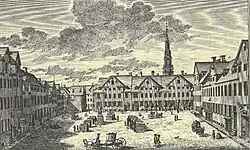 In the middle of the 17th century, Corfitz Ulfeldt built a mansion at the site and the square became known as Ulfeldts Plads (English: Ulfeldt's Square).[1] The mansion was demolished after his impeachment in 1663 and the subsequent confiscation of his property. Instead a pillar of shame was erected in the square to his disgrace, intended for people to spit on when passing it by.