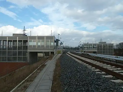 In order to improve access to the airport, an S-Bahn line was planned to the airport as early as 1958. There were also considerations of extending the line to the west to Rangsdorf or along the BAR to Ludwigsfelde.[3] The construction of the Berlin Wall on 13 August 1961 made a railway connection even more urgent. Travellers from the areas to the south of Berlin would be able to change to the S-Bahn in Schönefeld. So soon afterwards work started on the construction of the line.[2]