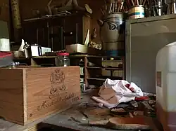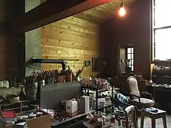 The studio of Balthus in one of the outbuildings of the Grand Chalet in 2018. Balthus died here on 18 February 2001, in the presence of his wife Setsuko and his daughter Harumi. After Balthus's death, everything was left as it was at the time of his death. On the wall hangs a photograph of Balthus's friend Alberto Giacometti. "Alberto is always with me when I paint," Balthus on Giacometti's photograph.[33]