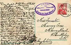 A postcard from 1914 with greetings from the Hotel Grand Chalet to Wimbledon. The postcard is postmarked 20 July 1914, eight days before the outbreak of World War I. During the war, British internees were housed in the Grand Chalet.[12]