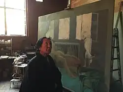 Balthus's widow Setsuko in Balthus's studio in front of one of the unfinished works in 2018.