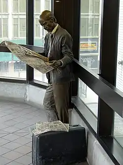 On the platform stands Catching Up, a bronze sculpture by John Seward Johnson II, depicting a man reading a newspaper while waiting for a train. The newspaper depicted is the actual May 21, 1987 issue of The Detroit News, with a headline breaking the news of that year's merger of Chrysler and American Motors, and advertisements for defunct Detroit-area retail chains Crowley's and Farmer Jack.[5][6] The News is said to have chosen over the competing Detroit Free Press by a coin toss; the Free Press is instead featured folded atop the man's briefcase.[7]