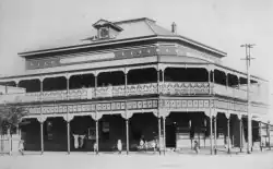 William Ashby was one of the first generation of purchasers of town land following the subdivision of portion 870. He had previously been a publican and in 1886 moved a modest timber hotel in sections from nearby Horton and erected it on his land as the Childers Hotel. This was for several years the only hotel in the town and was described in 1892 as a "comfortable hostelry". In 1894 the site was enlarged to its present size when Ashby purchased the adjoining block. In the same year three more hotel licenses were granted for the Queen's Hotel, the Bellevue Hotel, and the Royal Hotel and in 1898 the Palace Hotel opened. In 1897 the Childers Hotel was purchased by Johann Kulick who replaced it with a new two story brick hotel in 1899 to the design of Bundaberg architect Anton Hettrich.[1]