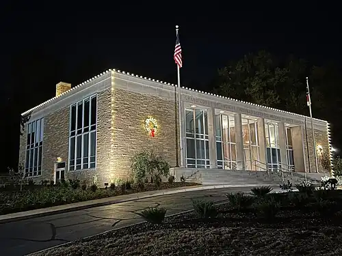 The cornerstone was laid on 15 Dec 1955 with masonic ceremonies.[102] Unlike the new temple at Wakestone, the building was situated outside of the city limits of Raleigh, across from the Raleigh Country Club (now Carolina Country Club). Boney crafted the space in the modern tradition, using permanent materials like marble, granite, Crab Orchard stone from Tennessee, bronze, aluminum, Indiana Limestone, and terrazzo with aluminum storefront on all four sides. The south end of the building contains an office and conference room for the Grand Master and the north end contains workspace and offices for the Grand Secretary and his staff.[103] The Grand Lodge circulated a press release prior to the laying of the cornerstone in 1955, stating: