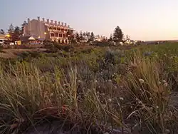 Southeast-facing view of the historic Marine Apartments over the coastal sand dune north of Grange jetty