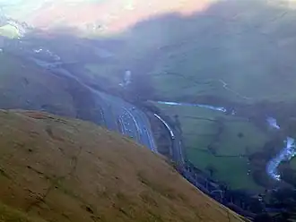 From near the summit, there are impressive views down into the gorge of the Lune valley, where road, West Coast Main Line railway, M6 motorway and the River Lune crowd between the outliers of the Lake District and the Howgill Fells.