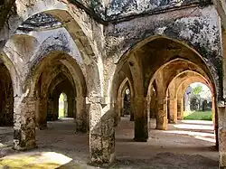 Residing on the coast of East Africa, the Great Mosque was one of the many structures in Kilwa that was built in a fairly common fashion of its time. Like its name suggests it was remarkably larger than the other mosques being built on the island.[2] The walls of the mosque were built and developed of generally squared and coursed coral stone. Often, the courses in between would have chips built in to level them out. These types of walls were barely made below the ground and were made with mud mortar. Columns also made of coral stone helped to support the high vaulted ceiling.[2] The floors were slowly made of lime plaster, and later, the walls were made of lime mortar.[3] There was also a separate domed chamber used for private worship by the sultan.[2] However, due to decline in wealth in Kilwa in the late 14th century, it led to less construction of buildings and building maintenance because the demand for lime and building stone lessened. Because of Kilwa's decline, the Great Mosque was reported to be in ruins.[4] The mosque collapsed during the rule of Abu'l Mawahib al-Hasan bin Sulaiman.[3]
