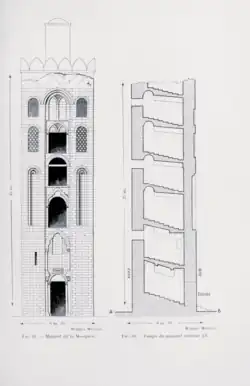 The minaret's decoration is carefully organized into three vertical registers.[3][19] At the forefront, a rectangular plaque adorned with palmettes and scrolls embellishes the entrance. In the middle, a series of blind or open arches, varying in shape from pointed to round, are superimposed.[8] Flanking this central register are blind niches, occasionally embellished with shell motifs, housing mosaic ceramic or cross designs remodeled in stucco at the rear, arranged symmetrically. Early researchers discerned in certain elements of the decoration a connection with ancient and Byzantine motifs.[6] The central register showcases, above the entrance door, a carved stone table, a partially preserved quintilobate arch, three stacked bays, and a recess with three semicircular arches. As for the lateral registers, they mirror each other's decoration, featuring, from bottom to top, a niche with a semi-cylindrical base crowned by a shell-shaped vault, and two niches with flat bases.[8][22]