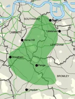 The Great North Wood was a natural oak woodland that started three miles (4.8 km) south-east of central London and scaled the Norwood Ridge. At its full extent, the wood's boundaries stretched almost as far as Croydon and as far north as Camberwell. It had occasional landownings as large clearings, well-established by the Middle Ages such as the hamlets of Penge and Dulwich.
