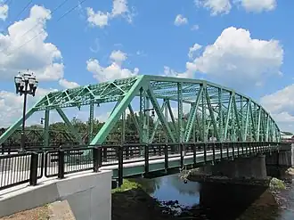 With time, however, the span became a bottleneck that figuratively split the city. Starting no later than the 1970s, people started talking about taking some sort of action, and the result was the construction of a similar bridge 150 feet (46 m) downstream of the original, begun in 2007.[1] The new bridge opened for traffic and the old one was closed for renovation on August 18, 2009. The area surrounding was improved with new sidewalks, lights, and pavement.[2] The upstream (1938) bridge carries three lanes of southbound traffic, and the downstream (2007) bridge carries three lanes northbound.[1] A small park lies between the approaches on both sides of the river.