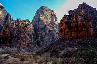 The Great White Throne[2] is a monolith, predominantly composed of white Navajo Sandstone in Zion National Park in Washington County in southwestern Utah, United States.[1] The north-west "main" face rises 2,350 feet (720 m) in 1,500 feet (460 m) from the floor of Zion Canyon near Angels Landing. It is often used as a symbol of Zion National Park. The Great White Throne can be seen from most locations along the scenic drive running through Zion Canyon.