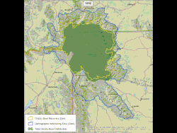 Yellowstone National Park boundaries were drawn in 1872 with the intent to include all the known geothermal basins in the region.[3] As landscape ecology considerations were not incorporated into original boundary, revisions were suggested to conform more closely to natural topographic features, such as the ridgeline of the Absaroka Range along the east boundary. In 1929, President Hoover signed the first bill changing the park's boundaries: The northwest corner now included a significant area of petrified trees; the northeast corner was defined by the watershed of Pebble Creek; the eastern boundary included the headwaters of the Lamar River and part of the watershed of the Yellowstone River. In 1932, President Hoover issued an executive order that added more than 7,000 acres (2,800 ha) between the north boundary and the Yellowstone River, west of Gardiner. These lands provided winter range for elk and other ungulates.[4] By the 1970s, the grizzly bear's (Ursus arctos) range in and near the park became the first informal minimum boundary of a theoretical "Greater Yellowstone Ecosystem" that included at least 4,000,000 acres (16,000 km2). Since then, definitions of the greater ecosystem's size have steadily grown larger. A 1994 study listed the size as 19,000,000 acres (76,890 km2), while a 1994 speech by a Greater Yellowstone Coalition leader enlarged that to 20,000,000 acres (80,000 km2).