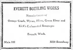 Green River soda was first created in 1916 in Davenport, Iowa, by Richard C. Jones, who owned a local confectionary shop.[6] In 1919, Jones sold his recipe to the Schoenhofen Edelweiss Brewing Company of Chicago.[1] Prior to 1920, the brewery produced the popular Edelweiss beer. Schoenhofen began manufacturing Green River and other soft drinks in order to survive the Prohibition Era.[7] It was also made by the Sweetwater Brewery in Green River, Wyoming. In 1928 Green River soda was produced by Spokane Bottling Works of Spokane, Washington,[8] and in 1935 was of several products produced by the Everett Bottling Works of Everett, Washington, which also produced Orange Crush, Hires and Wy-an sodas.[9] Green River soda's popularity is still remembered in Everett in the form of a "Green River milkshake" at Ray's Drive-In, which opened in 1962.[1]