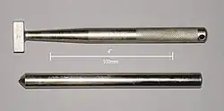 - Diamond dressers — Shorter handled diamond tools that either have a matrix of small diamonds bonded to a broad surface on the end of the dresser (top image) or a single diamond mounted in their face (lower image). As the diamond is introduced to the wheel's face, the harder diamond remains attached and the looser grains fall away.