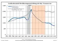 Development of population since 1875 within the current boundaries (Blue line: Population; Dotted line: Comparison to population development of Brandenburg state; Grey background: Time of Nazi rule; Red background: Time of communist rule)