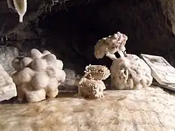 The Romans were present in the caves, as evidenced by the discovery of pottery, manual mills, and a graveyard, with seven gravestones remaining.[3] The grottoes were mostly formed during the Middle Ages, the stone (tuffeau) being used to build châteaux. Centuries later, the caves were flooded with water, slowly creating new passages. They were visited by Bernard Palissy in 1547, and an extension (the second grotto) was discovered by a speleologist (Gilles) in 1947. In the 1960s, the grottoes were managed by their owner as to allow access to tourists. They were added to ANECAT (Association Nationale des Exploitants de Cavernes Aménagées pour le Tourisme), and have since become a popular tourist attraction.[4]