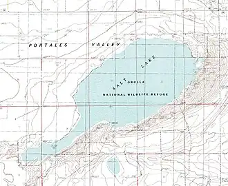 The central focal point of the Grulla National Wildlife Refuge is an ephemeral salt lake or saline playa – a shallow basin that collects runoff from the surrounding drainage area during heavy downpours but then often dries completely due to evaporation. This playa lake has been known by various names. Current USGS topographic maps and most commercially available maps of this region refer to this saline playa simply as "Salt Lake".[2][3] Back in the early 1880s, this playa was part of the DZ Ranch, and those familiar with the ranch often favor the name "DZ Lake". The lake is also frequently called "Arch Lake" after the nearby community of Arch, New Mexico, located around 6 km to the northwest.[4][5]