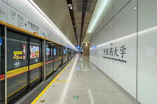 Guangzhou University of Chinese Medicine Station (simplified Chinese: 中医药大学站; traditional Chinese: 中醫藥大學站; Cantonese Yale: Zūngjījǒek Dǎaihǒk Jaahm) is a station on Line 11 of the Guangzhou Metro. It started operations on 28 December 2024.[1] It is located underground at the southwest of the intersection of Baiyun Avenue South,[2] Xiatang Road West[3] and Guangyuan Road Middle[4] in Baiyun District. As the name of the station suggests, it is located underground of the Sanyuanli Campus of the Guangzhou University of Chinese Medicine.