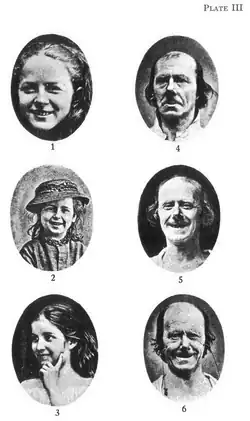 Duchenne used six living models in the scientific section, all but one of whom were his patients. His primary model, however, was an "old toothless man, with a thin face, whose features, without being absolutely ugly, approached ordinary triviality."[17] Through his experiments, Duchenne sought to capture the very "conditions that aesthetically constitute beauty."[18] He reiterated this in the aesthetic section of the book where he spoke of his desire to portray the "conditions of beauty: beauty of form associated with the exactness of the facial expression, pose and gesture."[19] Duchenne referred to these facial expressions as the "gymnastics of the soul". He replied to criticisms of his use of the old man by arguing that "every face could become spiritually beautiful through the accurate rendering of his or her emotions",[19] and furthermore said that because the patient was suffering from an anesthetic condition of the face, he could experiment upon the muscles of his face without causing him pain.
