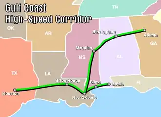 The Gulf Coast Corridor is one of ten federally designated high-speed rail corridors in the United States. The proposed corridor consists of three segments, each of which would carry trains capable of traveling at speeds of up to 110 mph: