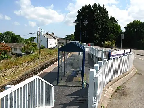 Gunnislake railway station (Cornish: Dowrgonna) serves the village of Gunnislake in Cornwall, England. There are also connecting buses from here to the town of Tavistock. However the station is located in or nearer to the villages of Drakewalls and Albaston. It is the northern terminus of the Tamar Valley Line from Plymouth.